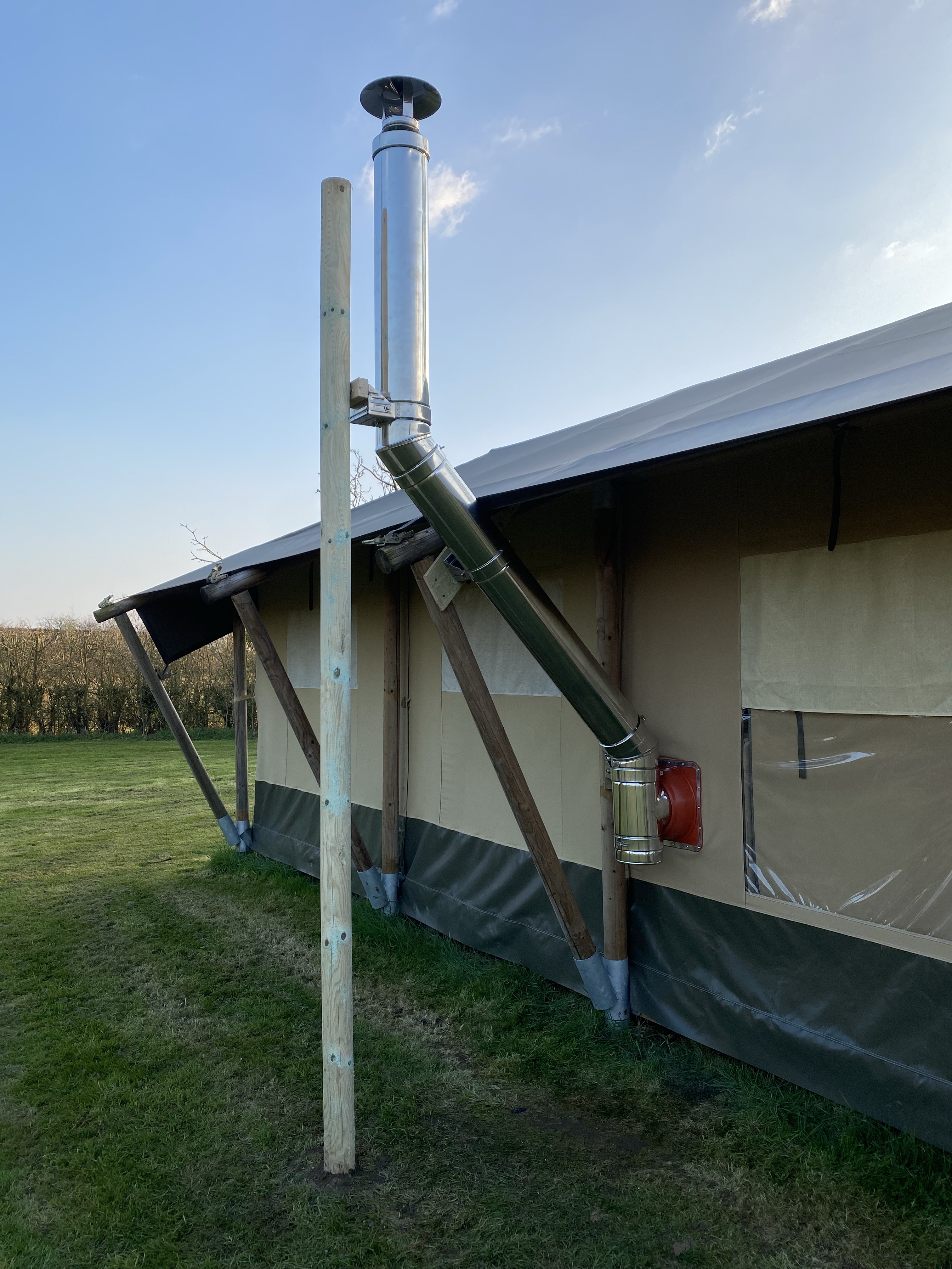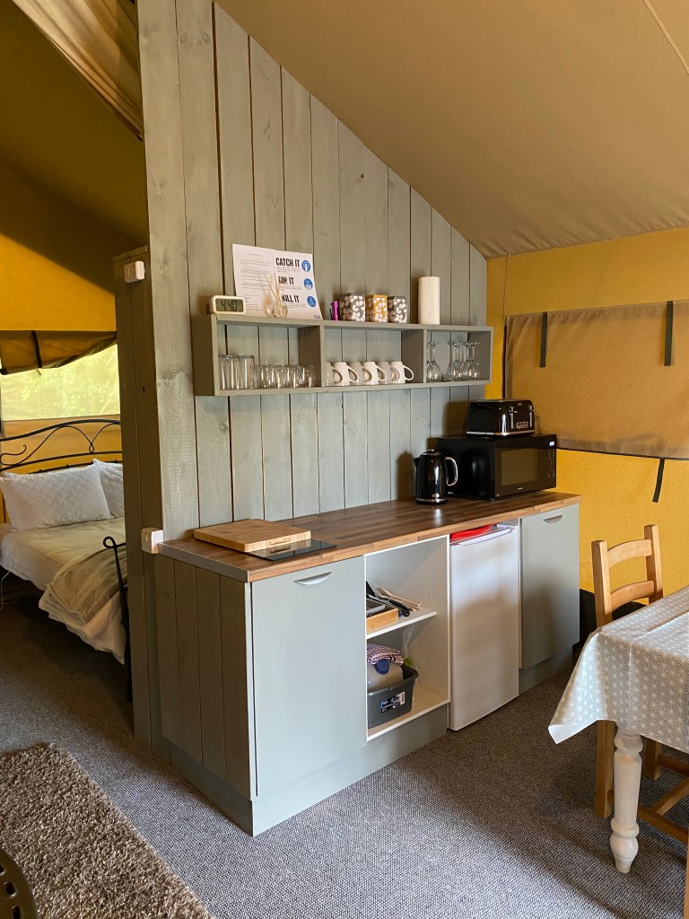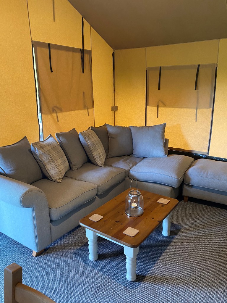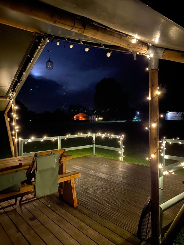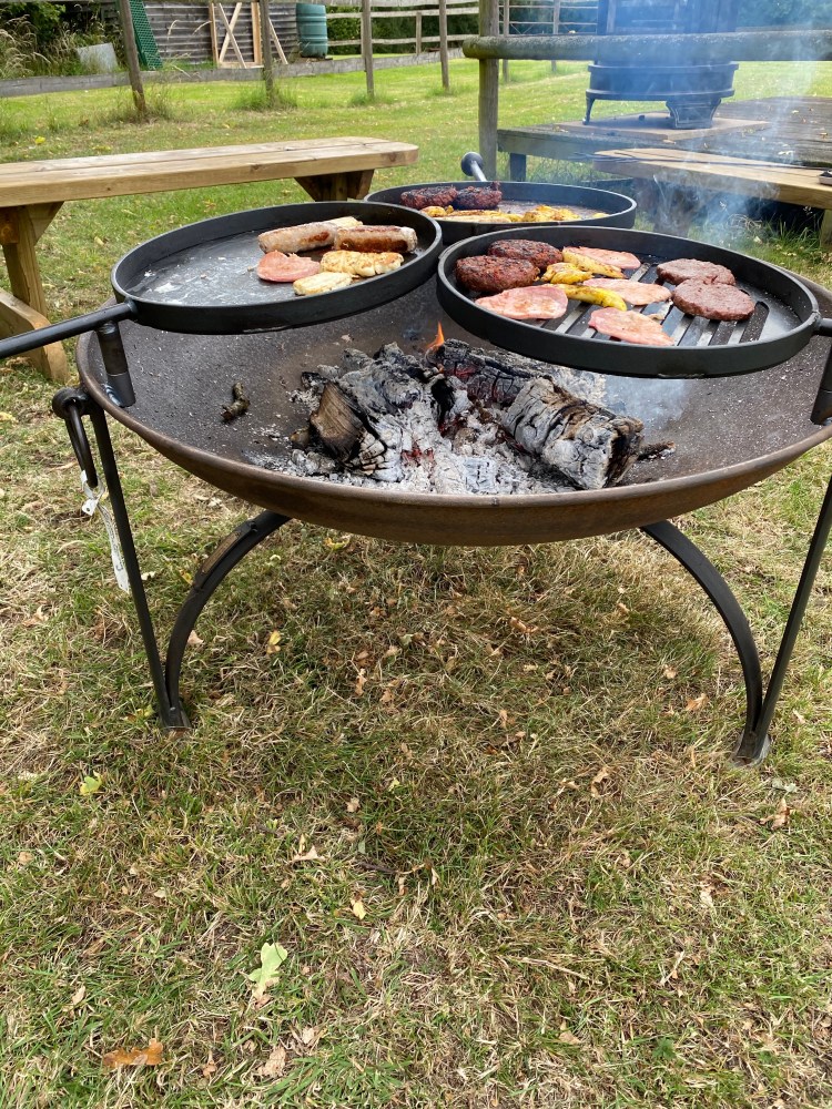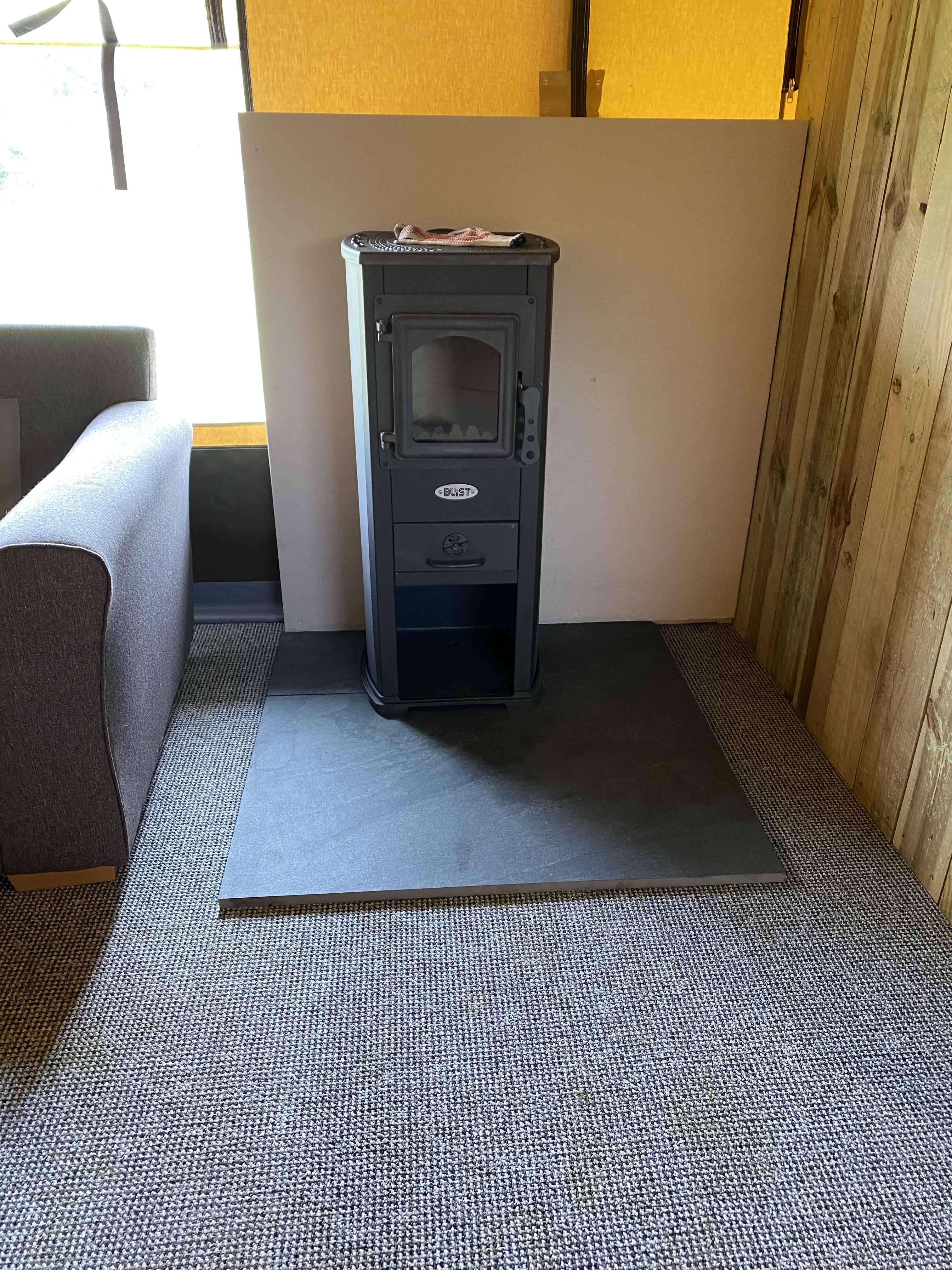 Each safari tent has a verandah with a chunky table and benches together with a log burner and fire pit which has a grill for cooking.