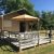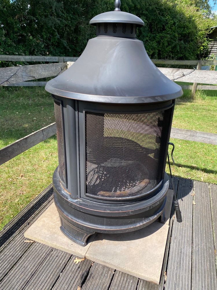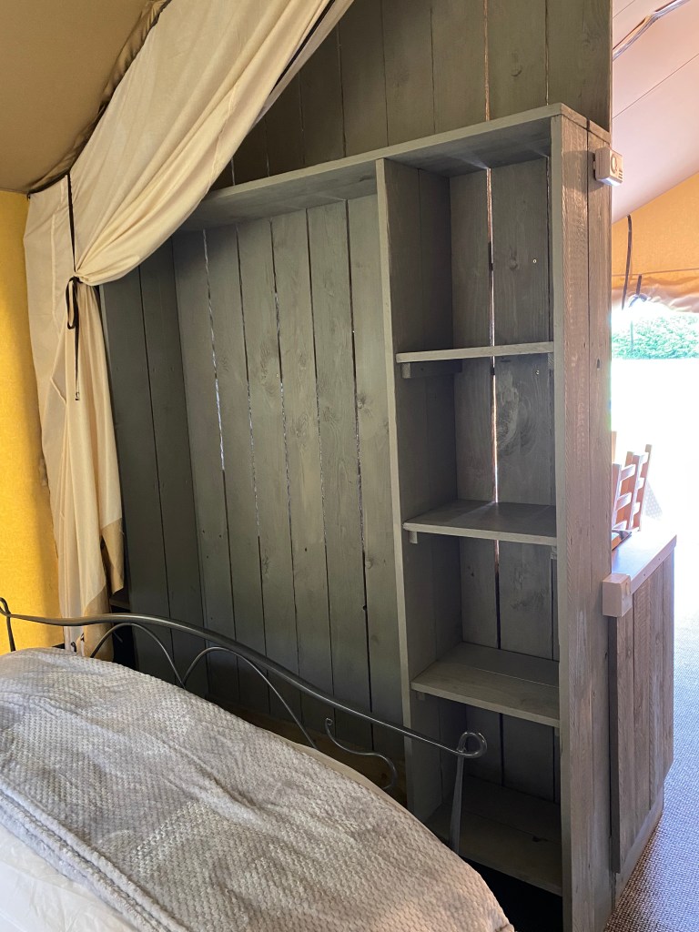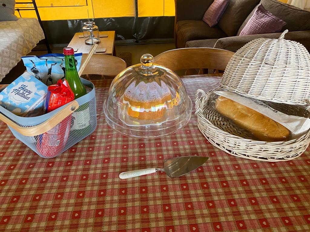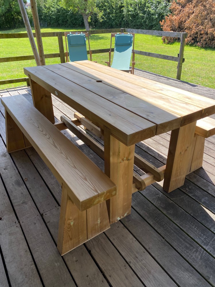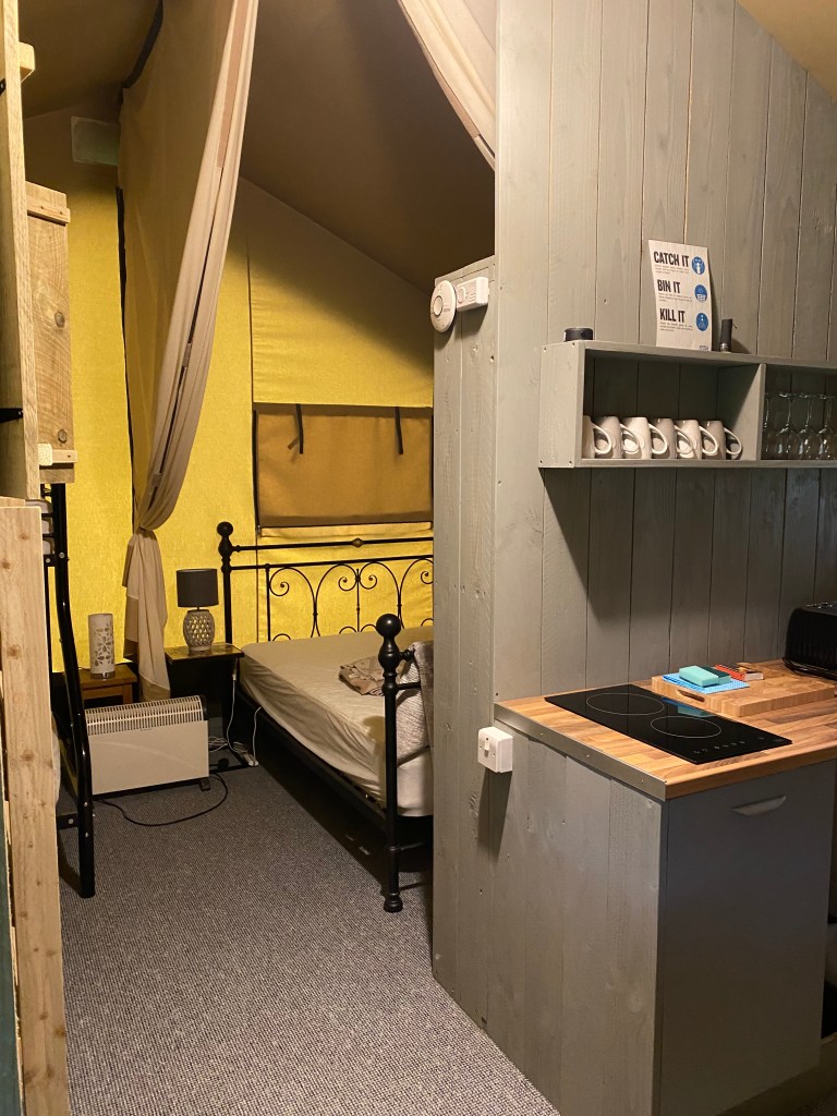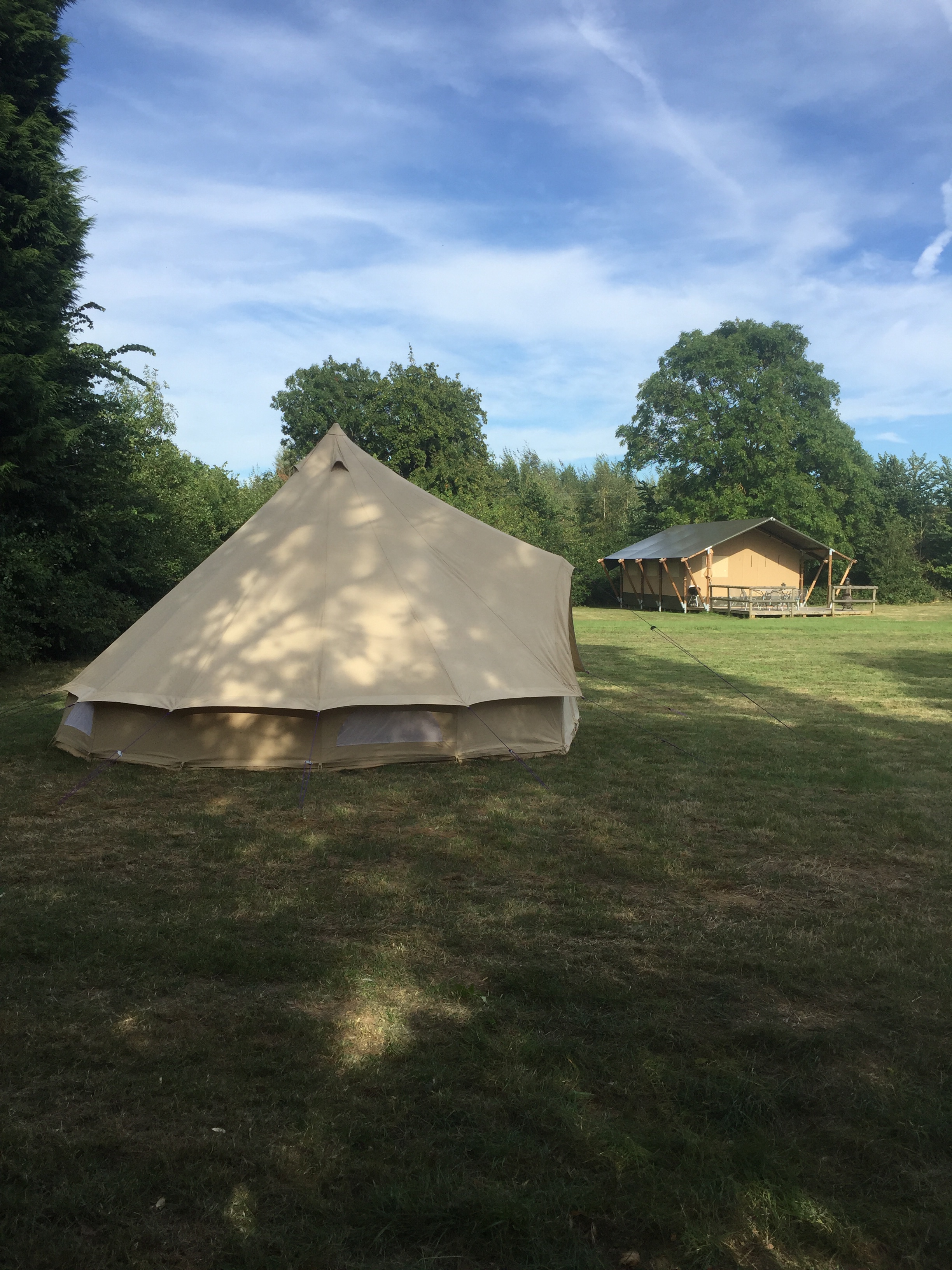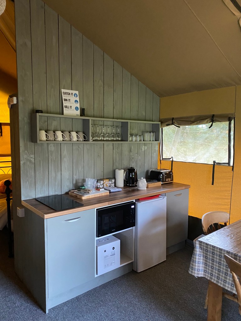 Each safari tent has a verandah with a chunky table and benches together with a log burner and fire pit which has a grill for cooking.